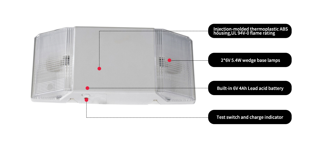 Áit / Toradh / Solas éigeandála / Solas éigeandála dé -cheann / Jeu4 2x5.4W Solas Éigeandála Ceann Lampa Seasta