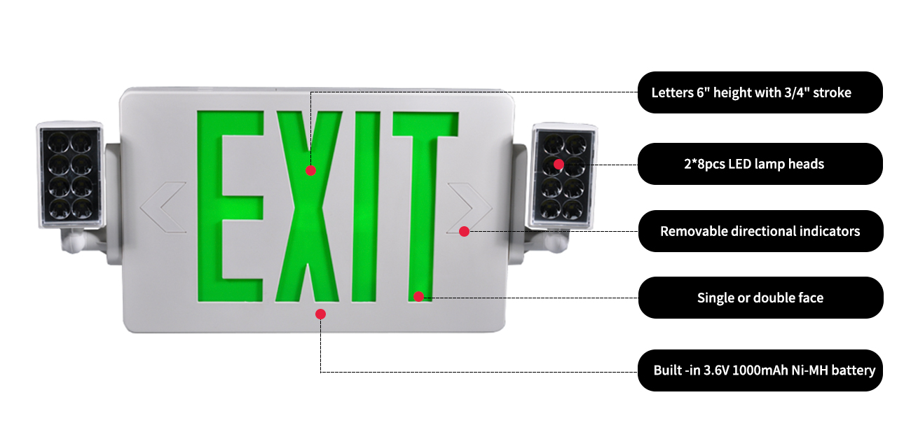 Comhartha imeachta éifeachtúil agus slán / teaglama solais éigeandála. Sábháil airgead ag ceannach an táirge 2-in-1 seo. Ceallraí fada, cothabhála íseal, cothabhála íseal. Oibreacha ar 120 - 277 voltas Uilíoch Vac. Áirítear ar an bpláta face saigheada clé/ar dheis. Tá an daingneán 1 nó 2 thaobh. Tá an táirge liostaithe ag OL agus buaileann sé le cóid éigeandála NFPA 101, OSHA agus OL 924. Mar shoilsiú baile, tráchtála agus tionsclaíoch, foirfe do halla, conair, ospidéal, árasáin, eaglaisí, malls siopadóireachta, ollmhargaí, scoileanna, óstán, teach tábhairne, bialann, stórais, foirgneamh oifige, etc.