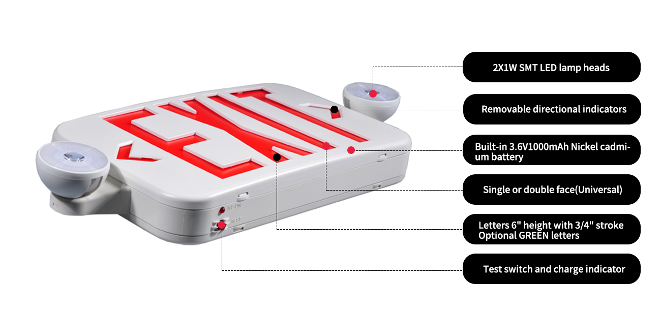 Comhartha imeachta éifeachtúil agus slán / teaglama solais éigeandála. Sábháil airgead ag ceannach an táirge 2-in-1 seo. Ceallraí fada, cothabhála íseal, cothabháil íseal. Oibreacha ar 120 - 277 voltas Uilíoch Vac. Áirítear ar an bpláta face saigheada clé/ar dheis. Tá an daingneán 1 nó 2 thaobh. Tá an táirge liostaithe ag OL agus buaileann sé le cóid éigeandála NFPA 101, OSHA agus OL 924. Mar shoilsiú baile, tráchtála agus tionsclaíoch, foirfe do halla, conair, ospidéal, árasáin, eaglaisí, malls siopadóireachta, ollmhargaí, scoileanna, óstán, teach tábhairne, bialann, stórais, foirgneamh oifige, etc.