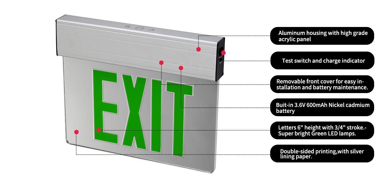An comhartha scoir deiridh i ndearadh agus i solúbthacht. Réiteoidh an comhartha imeachta imeall faoi stiúir glas seo beagnach aon fhadhb chumraíochta atá ag dul i méid.  Ceadaíonn an stíl amháin seo suiteáil uasteorainn, taobh, agus ballaí balla.  Tá an painéal Lit Edge tógtha as aicrileach ardghráid le saigheada treo saincheaptha chun dul i dtreo treo imeachta. Déanann an clúdach tosaigh inbhainte suiteáil agus cothabháil saor ó thinneas cinn!